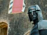 Later, with Robin and his Merry Men, The Doctor and Clara attend an archery contest held by the Sheriff. Robin, disguised as Tom the Tinkerer, faces against the Sheriff in the final round to win the prize of a golden arrow. As legend states, Robin is able to beat the Sheriff by splitting his arrow with his own shot. The Doctor suddenly appears and challenges the result, and readily splits Robin's arrow with his own. The two begin to challenge the other with more arrows until The Doctor impatiently explodes the target using his sonic screwdriver. The Sheriff, intrigued by The Doctor's power, orders the competition to end and commands his knights to capture them. However the knights turn out to be disguised robots when Robin cuts off one of the knight's arms, revealing circuitry. With the true nature of the knights revealed all of the knight's helmets open, revealing their unemotional, robotic faces. The Sheriff, realising his game is up, orders The Doctor, Clara and Robin to be taken away and placed in the dungeon of Nottingham Castle.